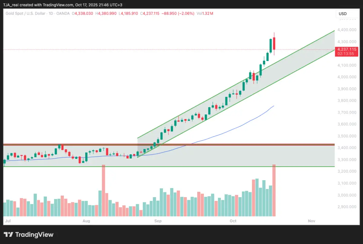 قیمت اونس طلا (XAU/USD) در هفته گذشته رشد چشمگیری را تجربه کرد و تا رکورد تاریخی ۴,۳۷۰ دلار پیش رفت. با این حال، در پایان معاملات جمعه و پس از شناسایی سود توسط معاملهگران، قیمت تا زیر ۴,۳۰۰ دلار اصلاح شد.